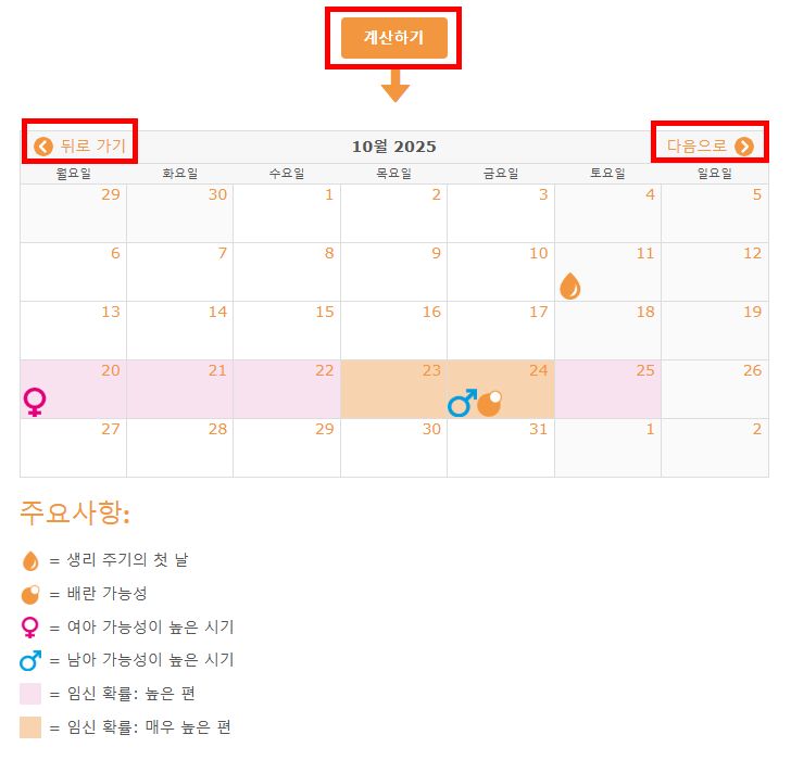 계산기를 실행하면 아래처럼 달력에 배란일, 가임기, 임신 가능성 높은 날짜가 표시됩니다.